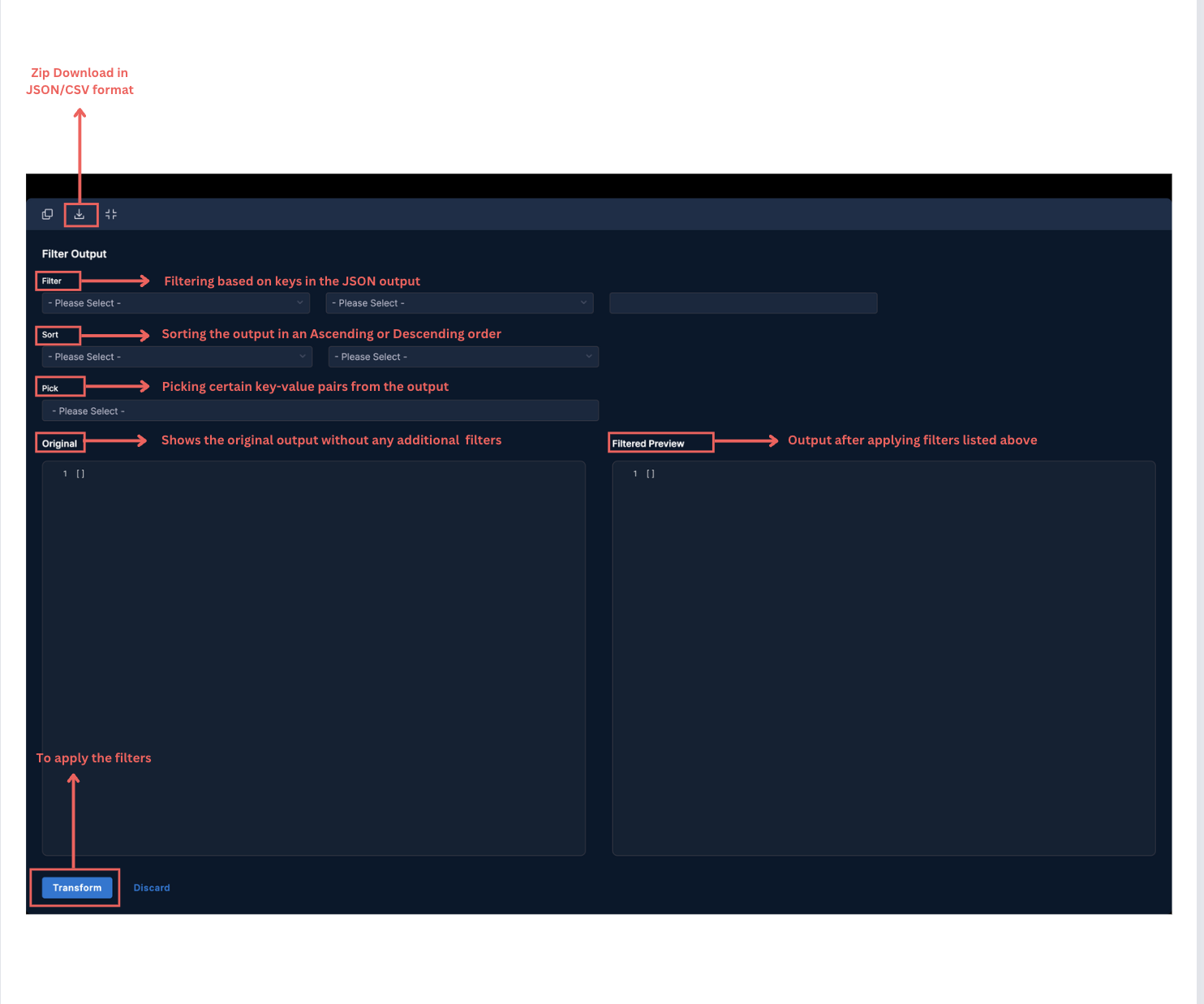 If output needs to be streamlined and only a few keys-value pairs are required, 'Pick' functionality can be used. Using this, users can pick only the required keys and see the data associated with them in the output.