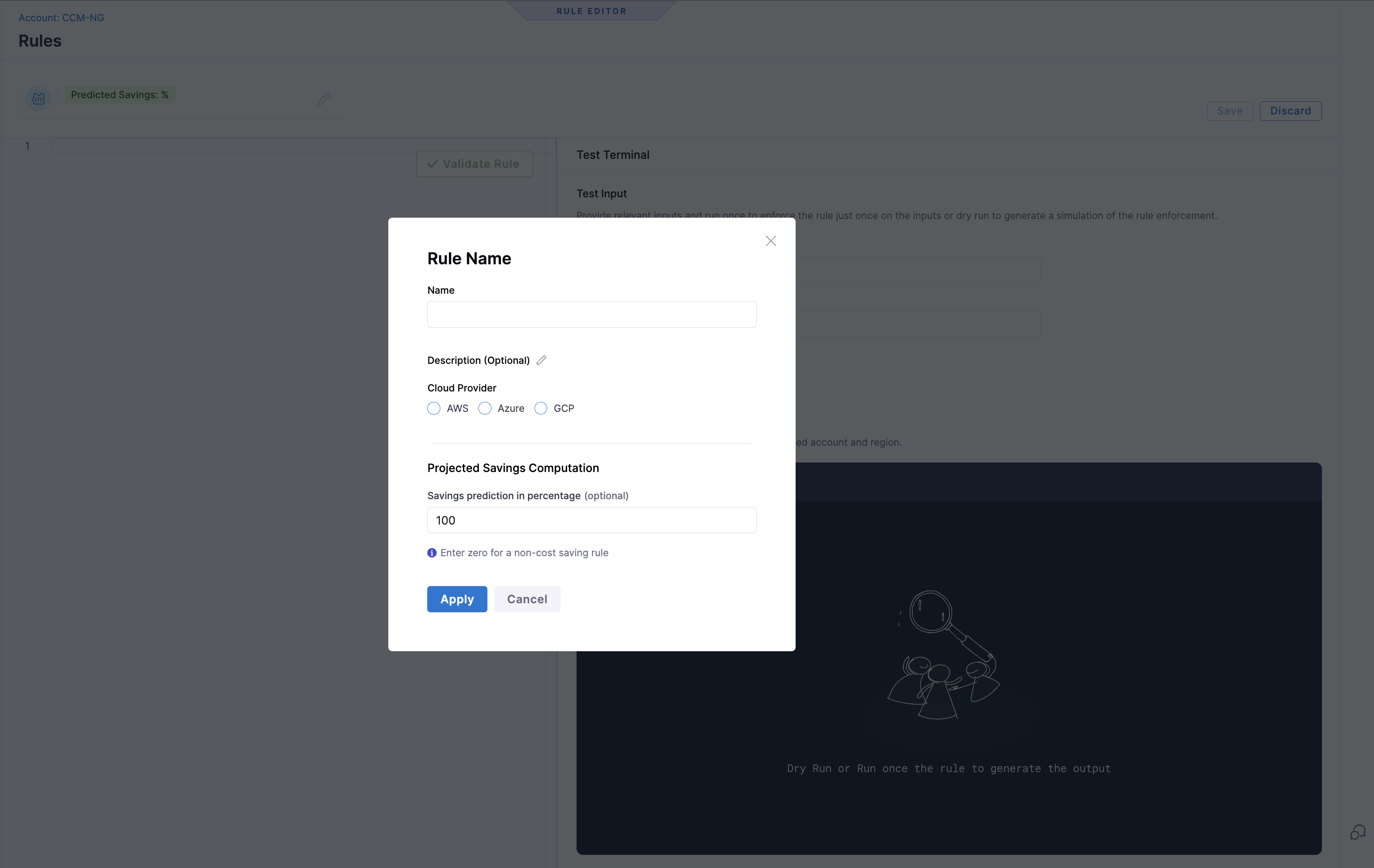 In the rule editor, a test terminal is present for users to see the output in the terminal itself upon evaluating a Rule. This is done to ensure that users can run the rules and try accordingly to check how the output would look on the selected subscription and region. There are two options: first, to select the target subscription and second, to select the regions. After providing the relevant inputs, the users can select either to dry run the rule first, run it once or enforce the rule.