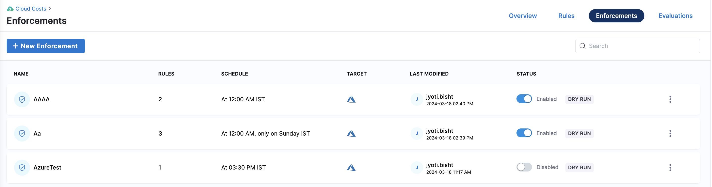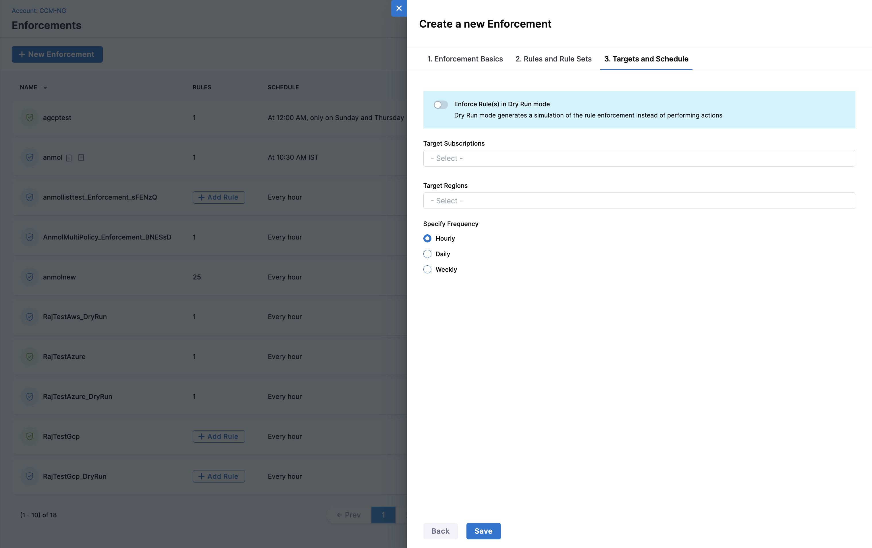 Enforcements enable you to enforce a certain set of Rules or Rule Sets (also known as governance guardrails) against a specific set of targets (accounts, projects, or subscriptions) to run periodically. Sometimes, we need rules to run periodically, such as every day, week, or month. However, running these rules manually every day or week at a specified time creates extra overhead and is a slow process prone to manual errors. To solve this, Enforcements allow users to set up a timely schedule and choose the day, time, and frequency for their rules or rule sets.