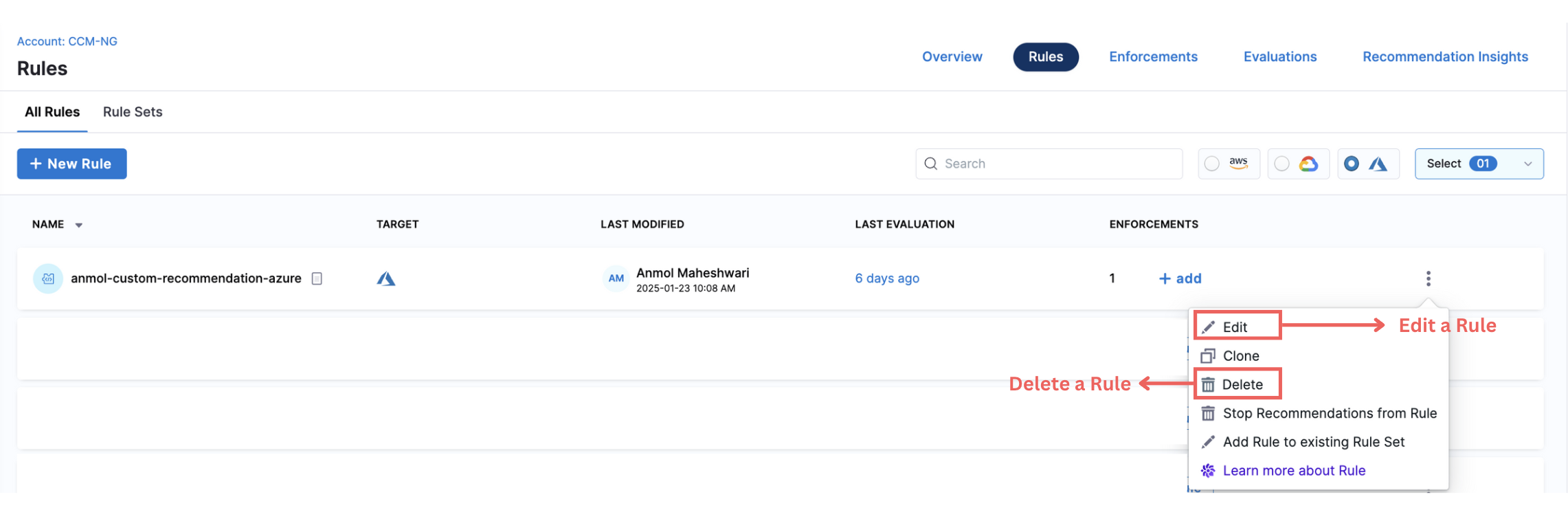You can view any Enforcements on Rule Enforcements page. Click on the enforcement to view details such as the rules, target accounts, and regions included in the enforcement. For updating, you can use the "Edit" button from the vertical ellipsis menu (⋮) to update the enforcements as per your convenience.