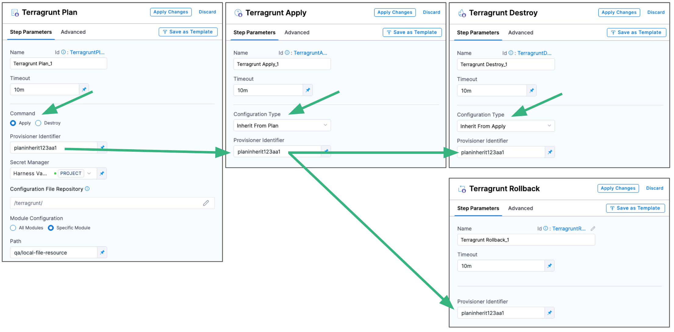 - Terraform Terragrunt step: the Terraform Apply step simply inherits its configuration from the Terragrunt Plan step you already configured and applies it.