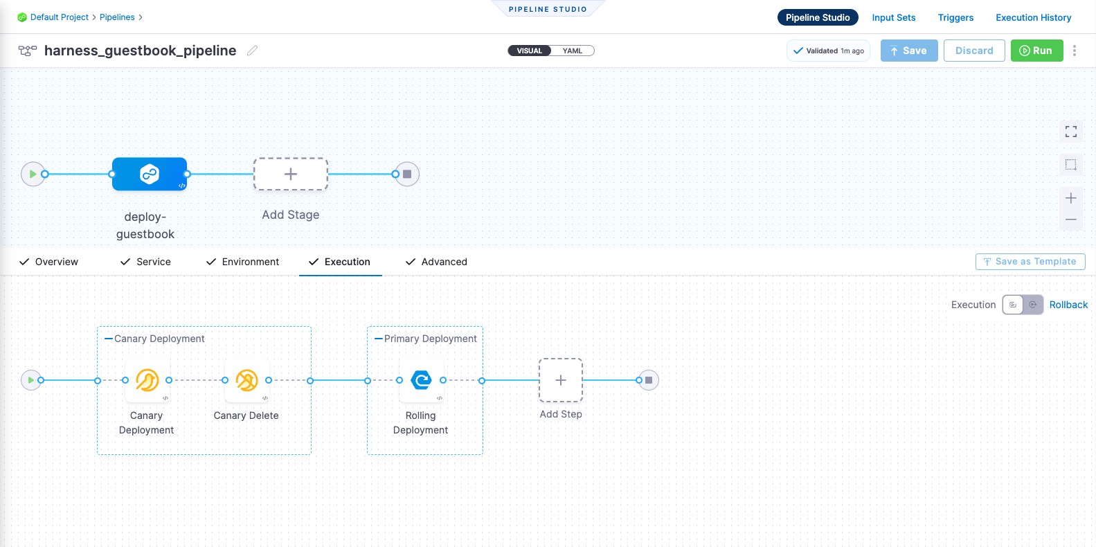 Harness CD pipelines allow you to orchestrate and automate your deployment workflows, and push updated application images to your target Kubernetes cluster. Pipelines allow extensive control over how you want to progress artifacts through various dev / test / stage / prod clusters, while running a variety of scans & tests to ensure quality and stability standards you and team may have defined.