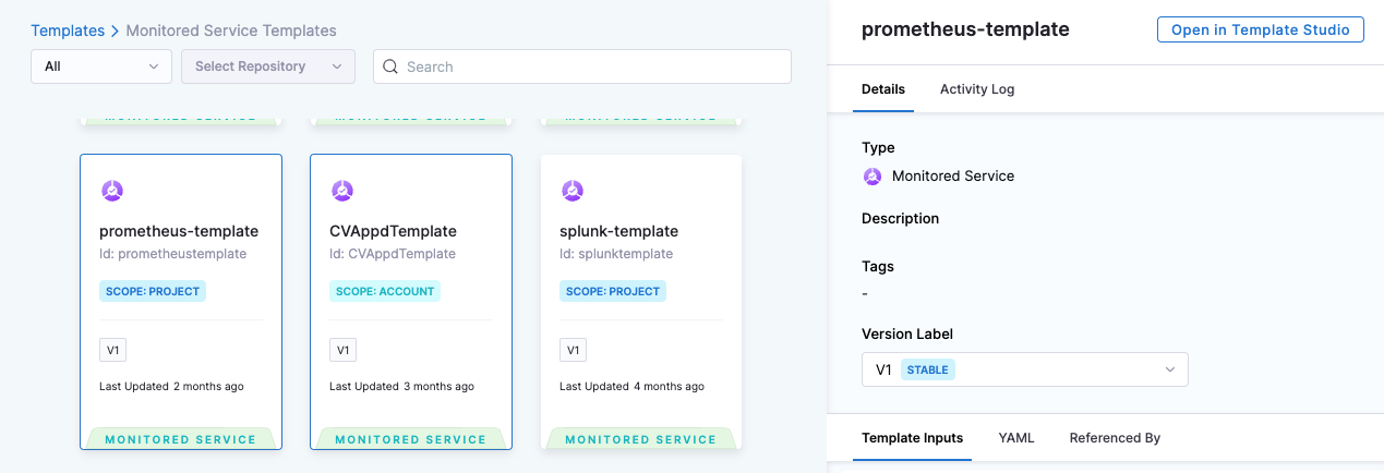 To select a monitored service template, select Template under Monitored Service > Monitored Service Type in the Verify step configuration page. The template input can be a fixed value or runtime input.