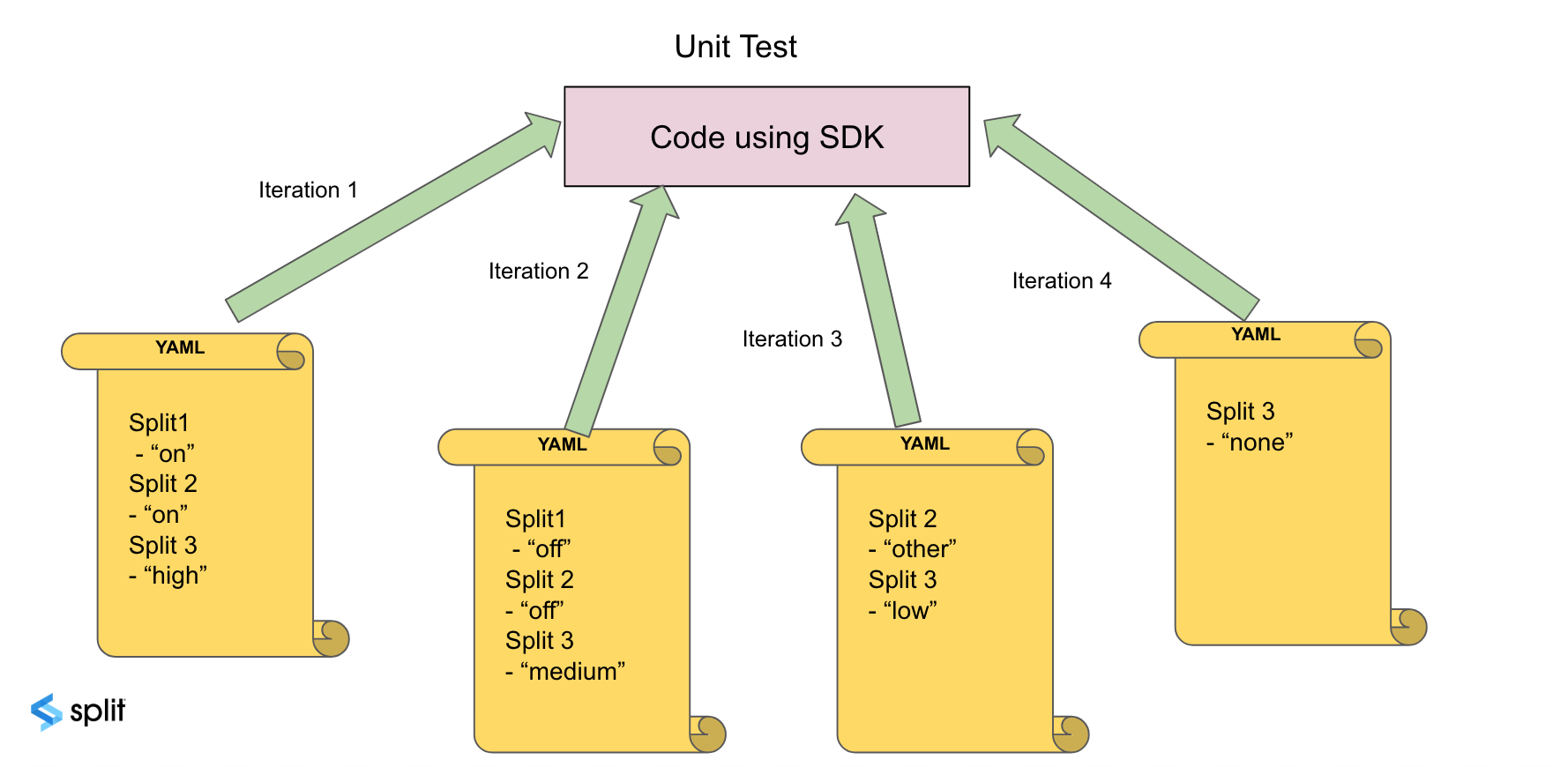 Each SDK language support localhost mode which reads the Split names and their treatments from a local YAML file, instead of connecting to Split cloud. This enables the creation of multiple YAML files, each with unique treatment values and cycle through all the possible treatments returned from each Split.