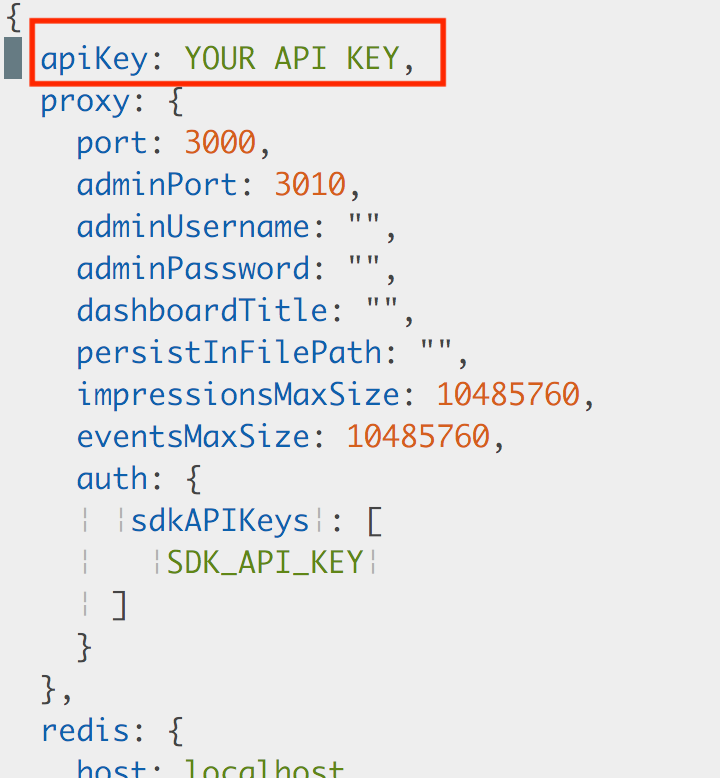 • JSON configuration file: The apiKey property is used to issue requests against Harness FME servers.