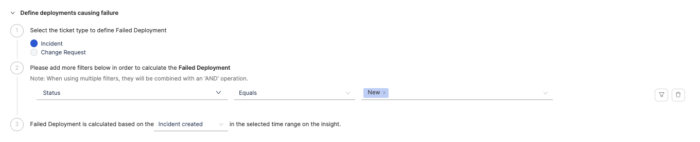 - Configure additional attributes to define deployments that result in failure or total deployments. When applying multiple filters, they will be combined using an 'AND' operation. A failed Deployment can be a hotfix or a deployment that led to failure.
