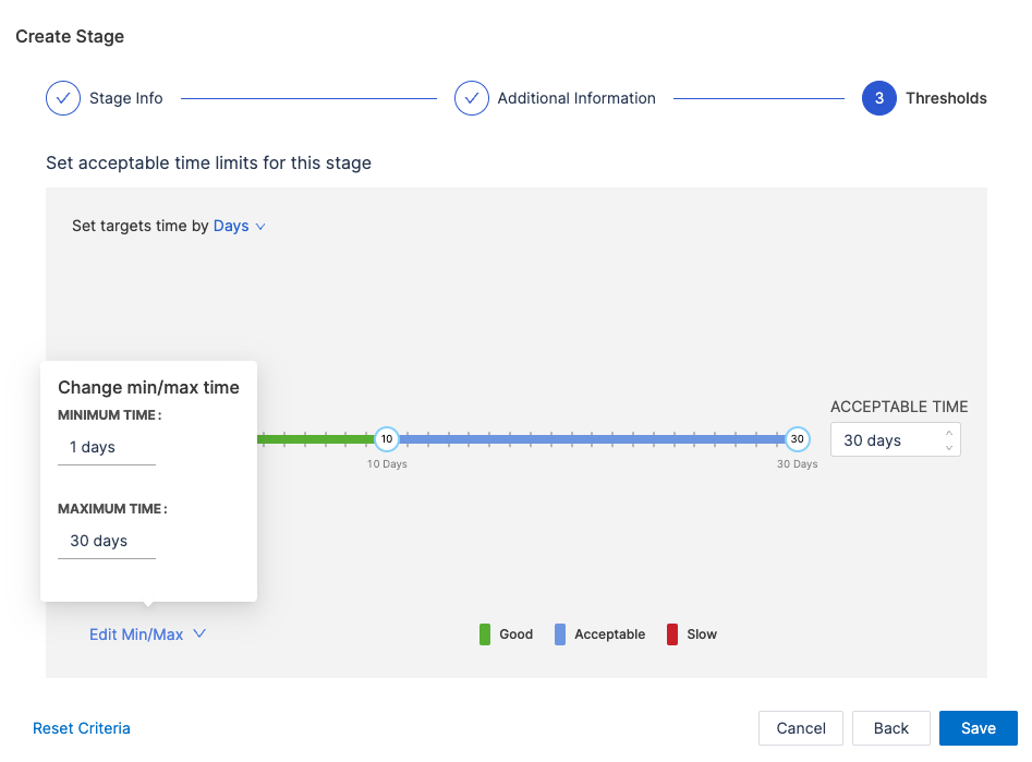 - Set acceptable time ranges for the stage, such as Ideal Time and Acceptable Time.