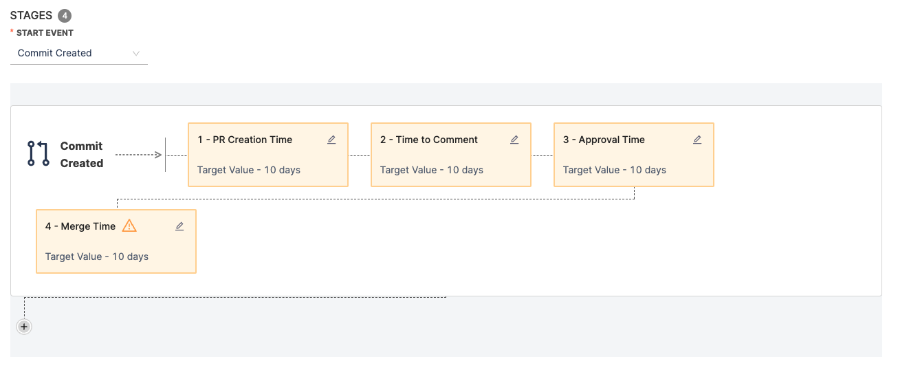 - Select an event that identifies the end of the stage (e.g., PR Created or specific labels added to the PR).