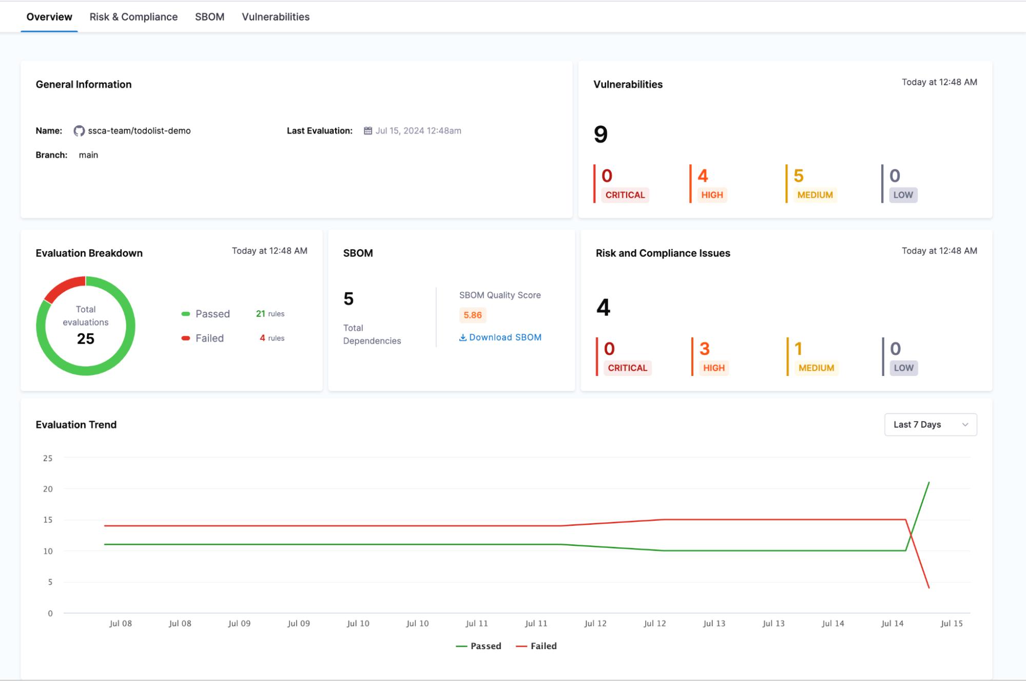 - Evaluation Trend: This graph presents the trend of evaluations over time, showing the number of rules passing and failing with respect to the date. This helps users visualize the improvement or decline in the security posture of their repositories.