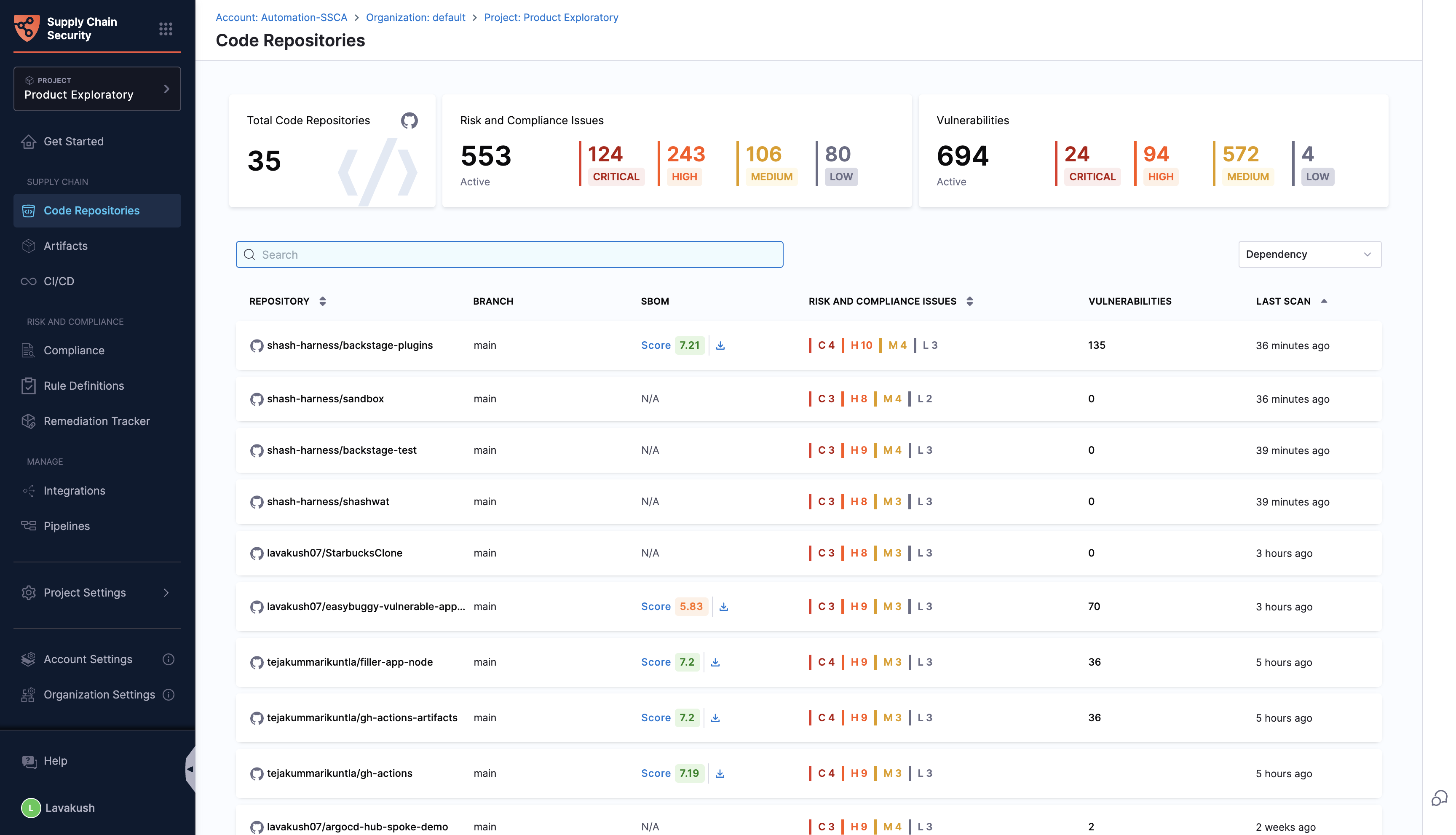 - Risk and Compliance Issues: Provides visibility into all the issues related to risk and compliance derived from code repository configurations and organization settings based on compliance standards.