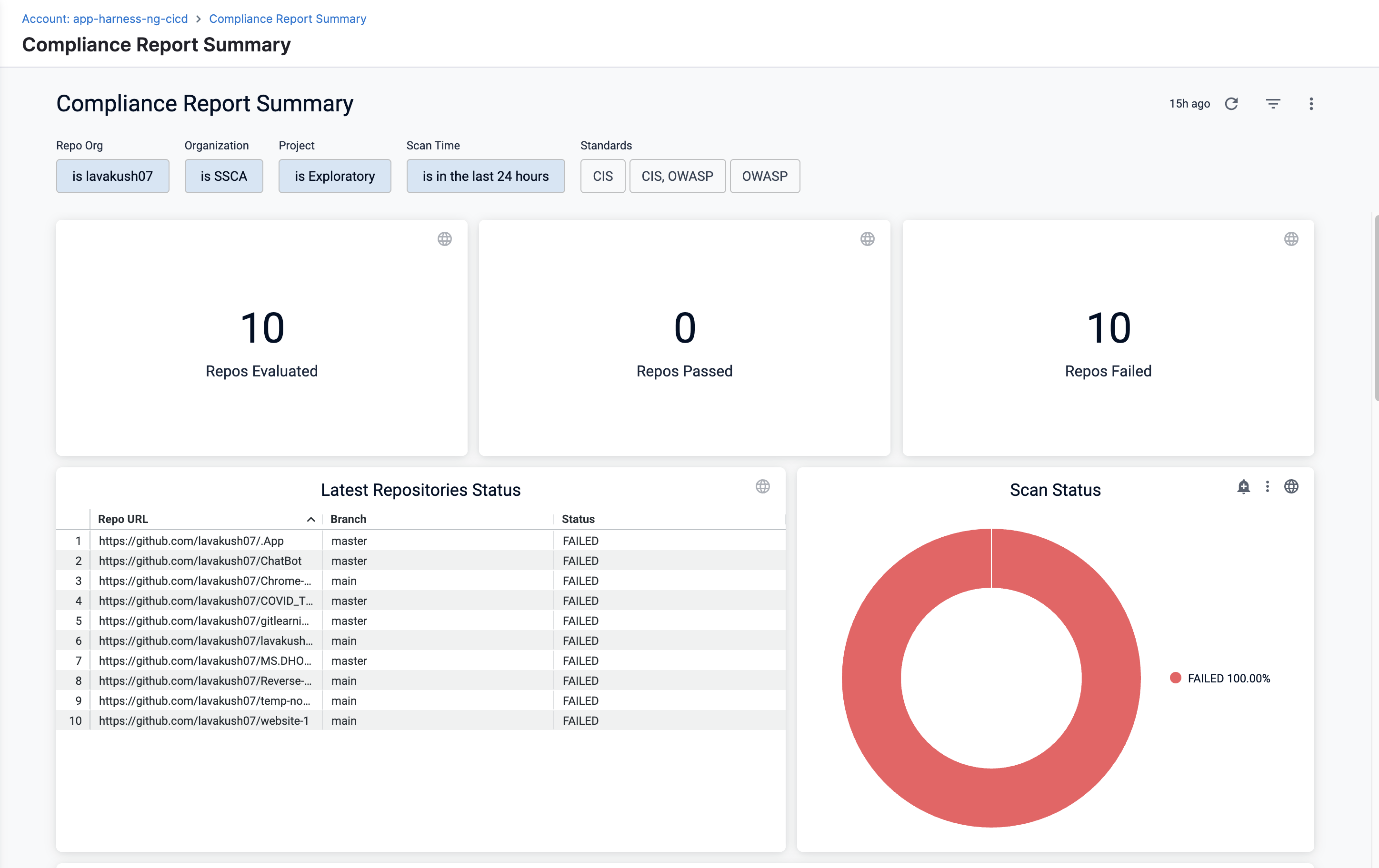 This dashboard provides a centralized view of repository-level compliance evaluations against widely accepted security benchmarks such as Top 10 OWASP CI/CD and CIS Benchmarks.